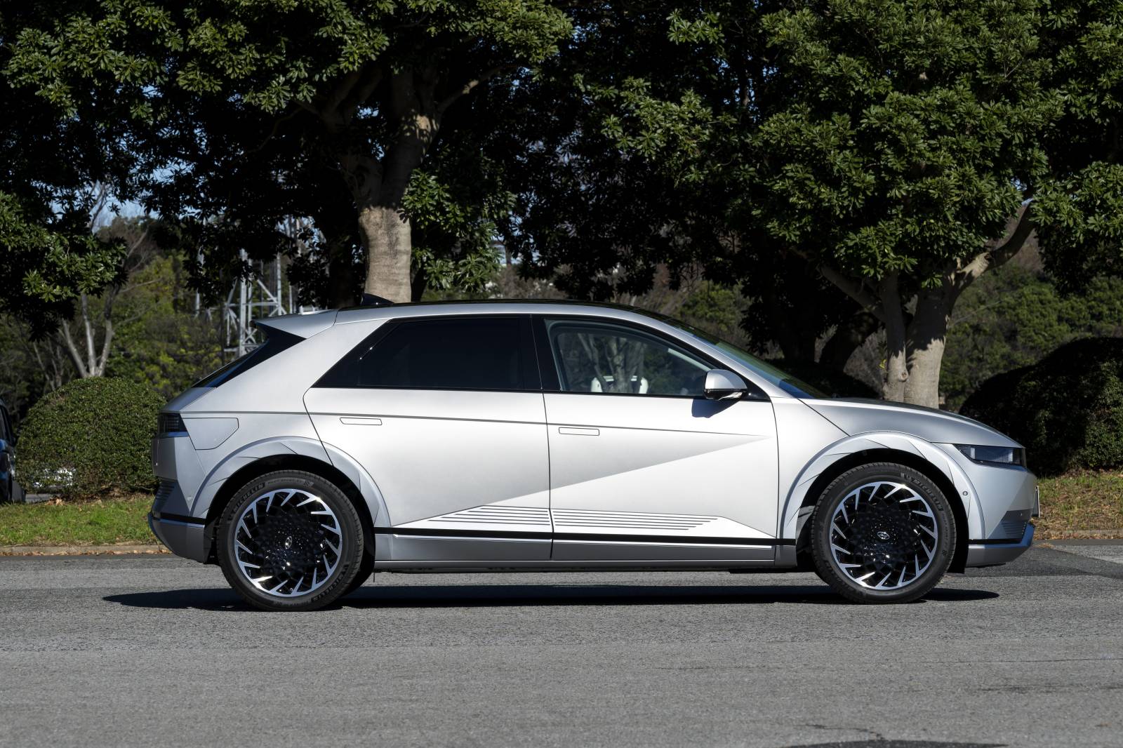 車体のサイズは全長4,635mm、全幅1,890mm、全高1,645mm。わかりやすそうなところで比較してみるなら、bZ4Xよりも60mm短く、40mm幅広く、10mm低い数値だ。まだbZ4Xを街で見かけることはほとんどないだろうからわかりやすいともいえないのだが、サイズとしては小さめのDセグメントといったところ。いずれにしても写真などで見かけるイメージほど小さいクルマではない、ということだ。実際に走らせてみても、アイオニック5のほうが少しワイドだが感覚的にはトヨタ・ハリアーとかマツダCX-5をドライブしているときに近い。街中の細い裏路地やタイトなワインディングロードでは、持て余すとまではいかないものの、気持ちがやや引き締まる感じだ。にも関わらずアイオニック5がコンパクトに見えるのは、ほかのライバルたちがSUVスタイルを採用しているのに対し、ハッチバックのようなスタイリングデザインとされているからにほかならないだろう。ヒョンデはこれをCUV(Crossover Utility Vehicle)スタイルとカタログの中で謳っているが、これはクロスオーバーなどではなく、どう見ても5ドアのハッチバックだ。それも──まぁ好みはあるだろうけれど──かなり見栄えのいいハッチバックだと思う。