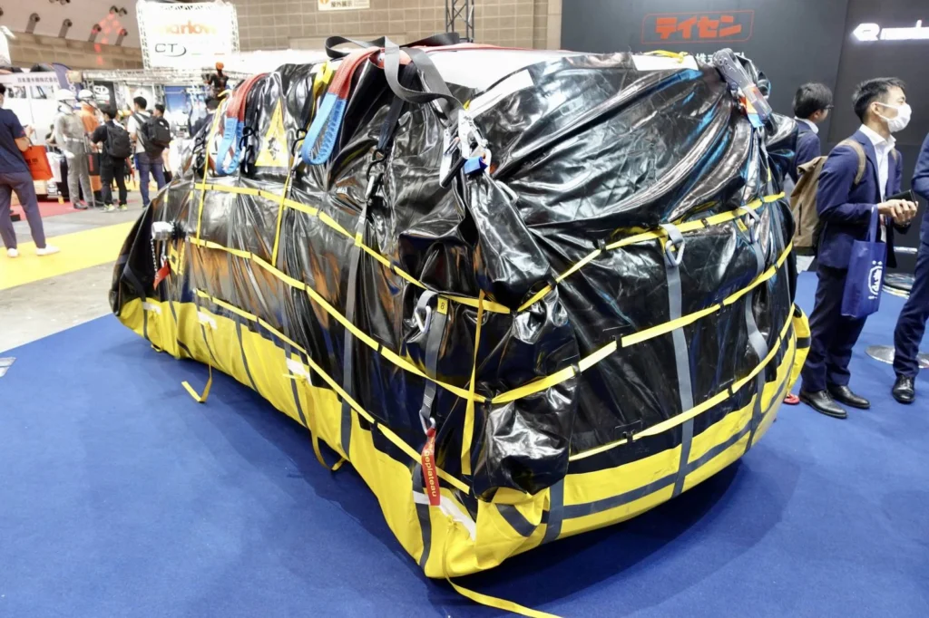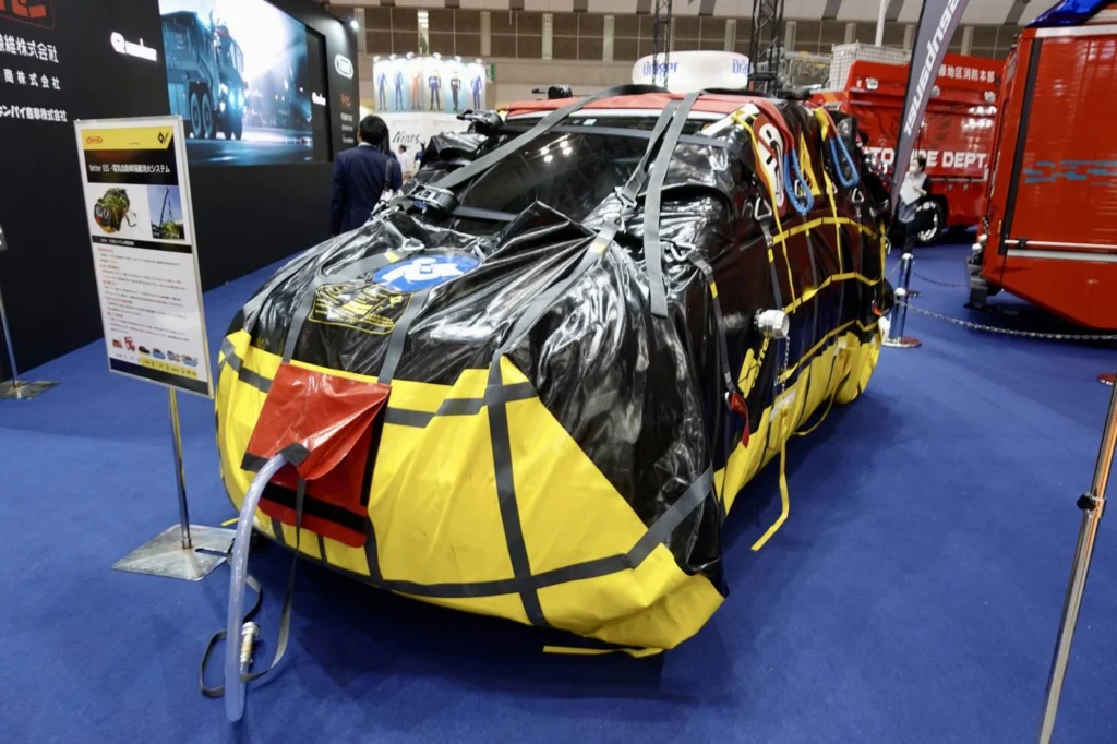 他にも帝国繊維のブースでは、「Vetter EIS」EV隔離消火システムも展示。EVの火災消火後の再燃を防ぐため、一旦消火した後に「Vetter EIS」で車両を包み、その中に水を入れて消火する。