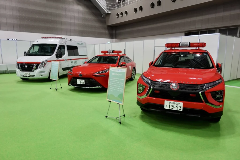 今回の主催者でもある東京消防庁は、様々な消防車両を展示・デモをしていた。EV関係では、FCEVの「トヨタ・ミライ」、「三菱エクリプスクロスPHEV」をベースにした査察広報車を出展。災害現場での情報収集や広報活動を支援する車両だという。