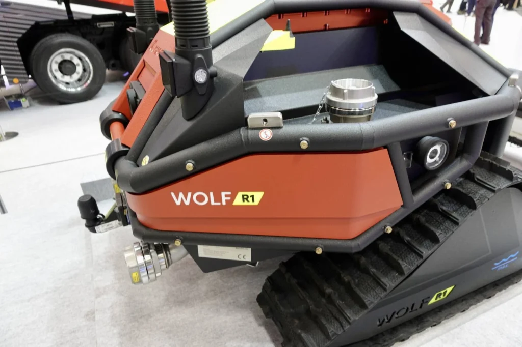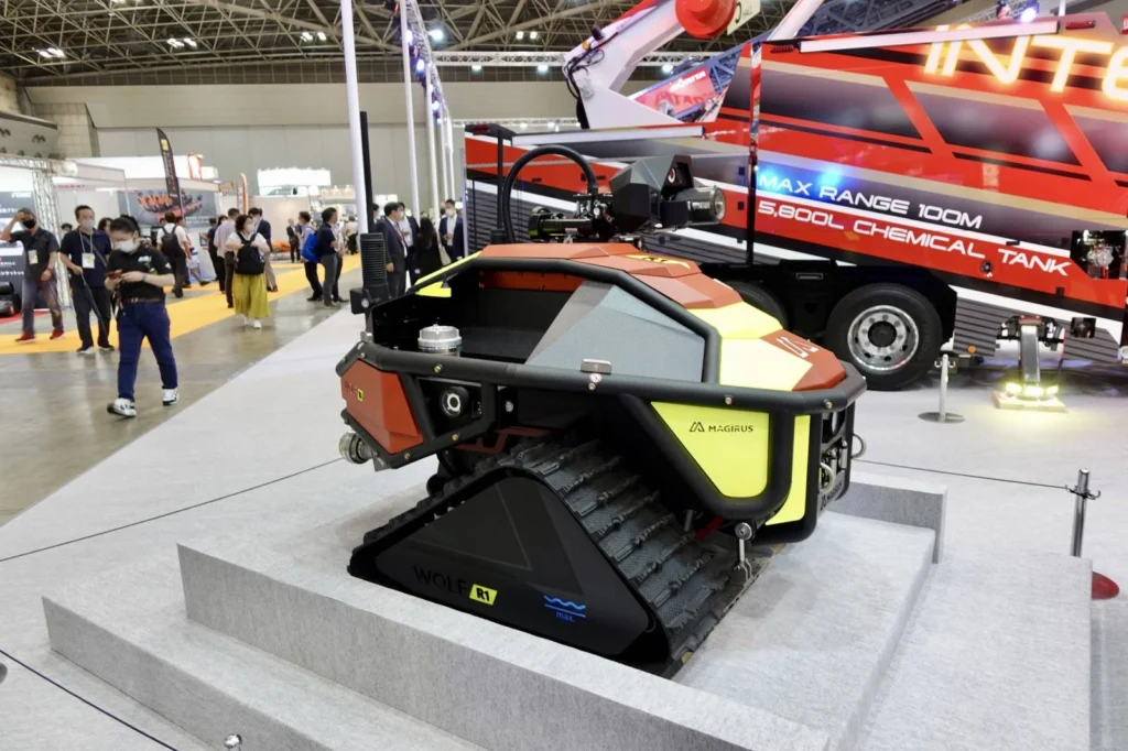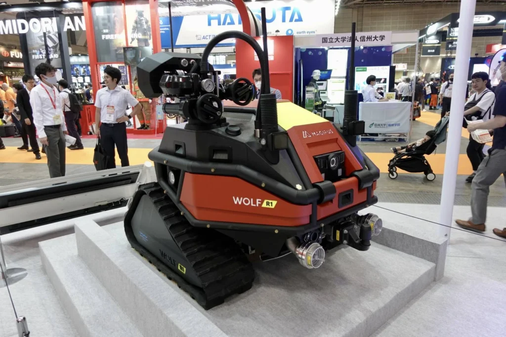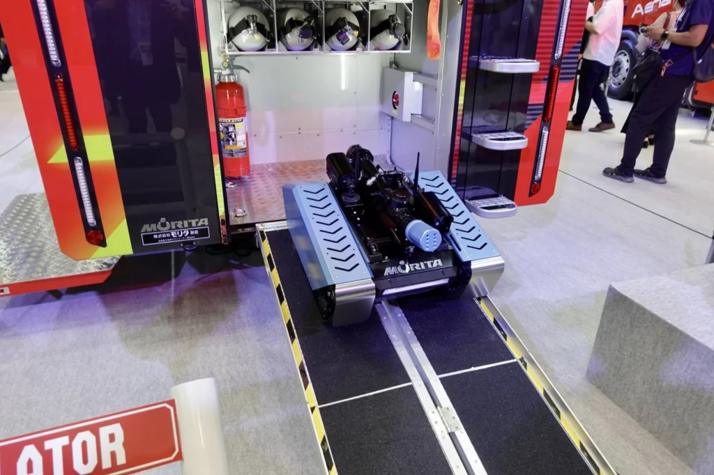 また、多目的消防戦術ロボット「ウォルフR1」を展示。バッテリー駆動の遠隔操作型消防用ロボットで、2,000L/分の電動放水銃を装備。倉庫火災・トンネル火災など危険な現場で威力を発揮するという。