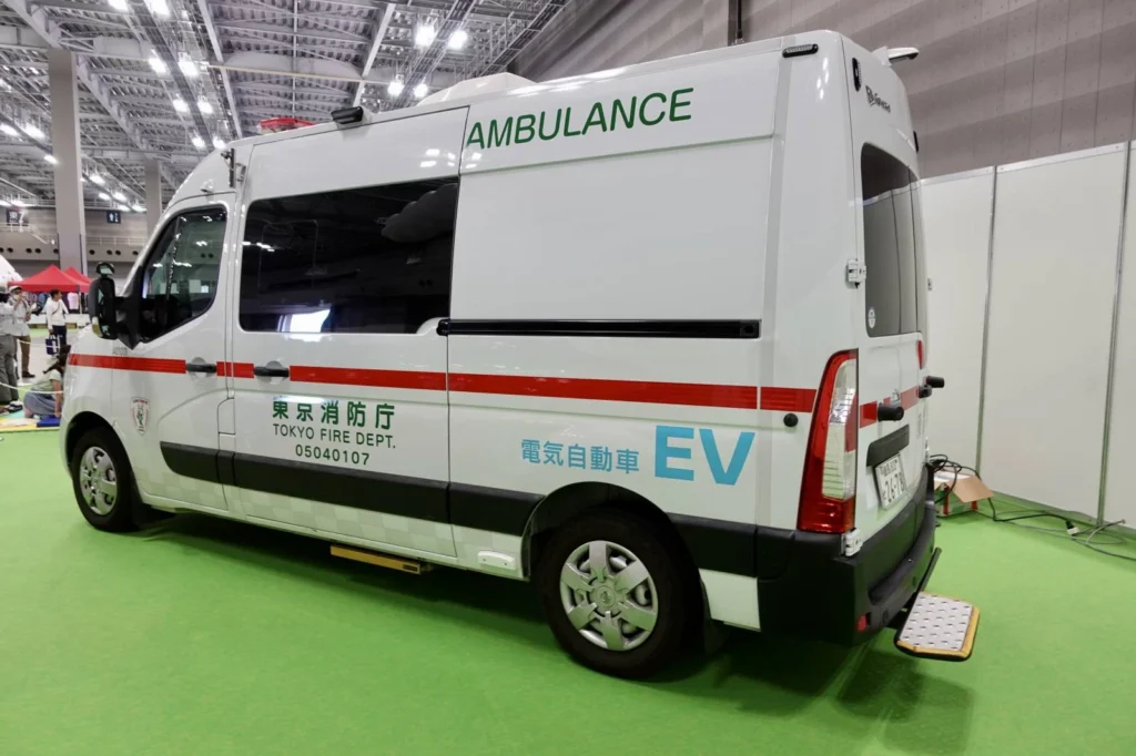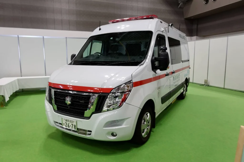 またEVの特殊救急車として国内で初めて導入(2020年)された「日産NV400」を展示。この車両は欧州仕様となる。バッテリー容量は33kWhで130kmの航続が可能。電動ストレッチャーまで装備する。