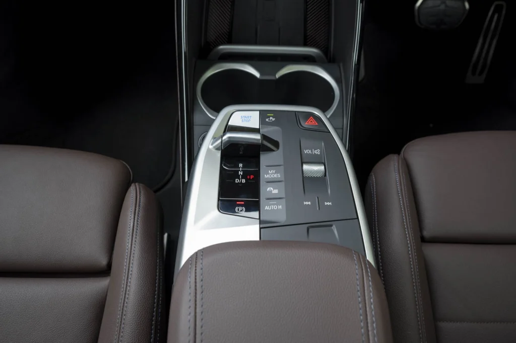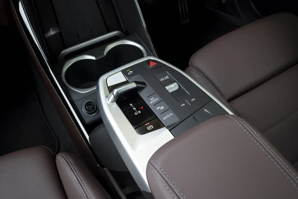 高い位置に浮かぶセンターアームレストには、いわゆるシフトレバーがなく、かわりにスイッチを前後に動かして操作するシフトセレクターが配置されている。