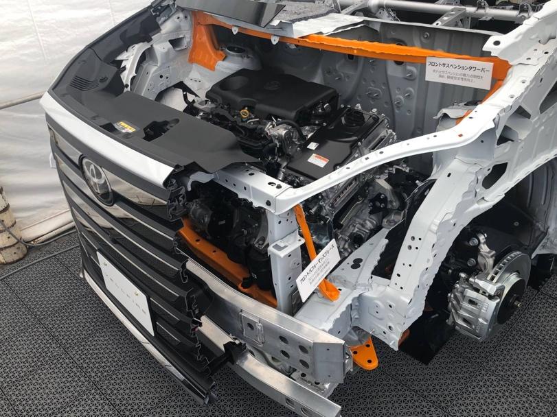 新型アルファード・ヴェルファイアの技術展示で車体床部を見た様子。筆者撮影。