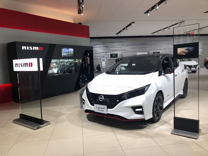 日産横浜本社ショールームに展示される「リーフNISMO」。筆者撮影。