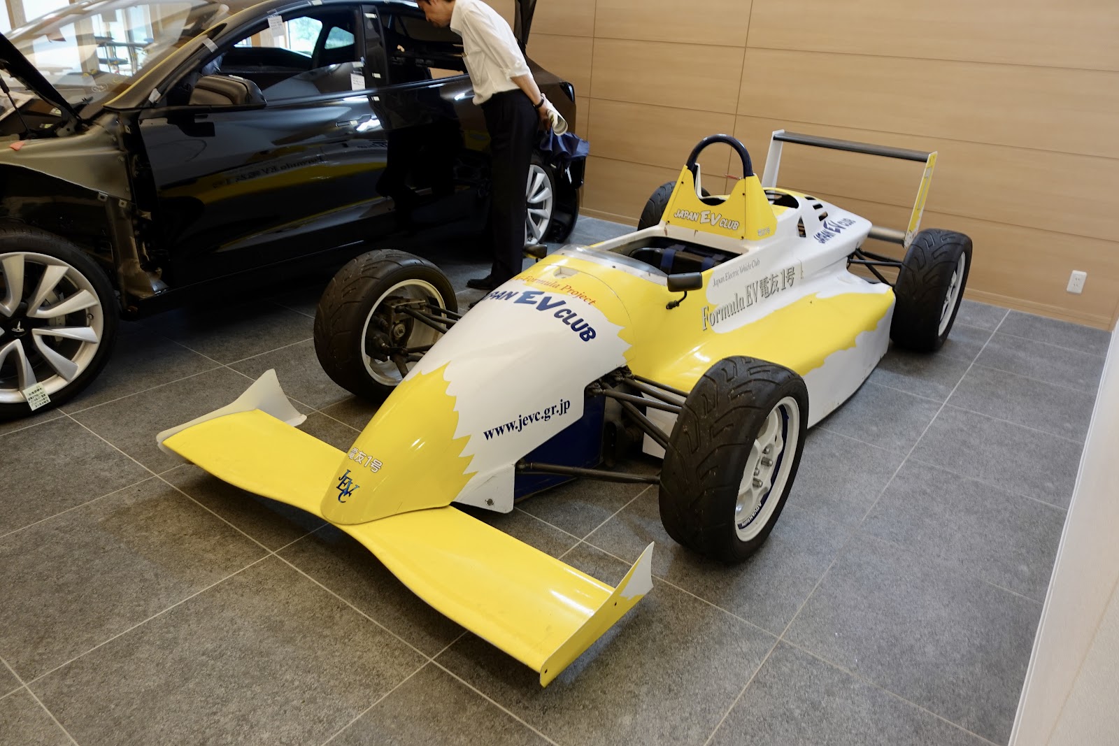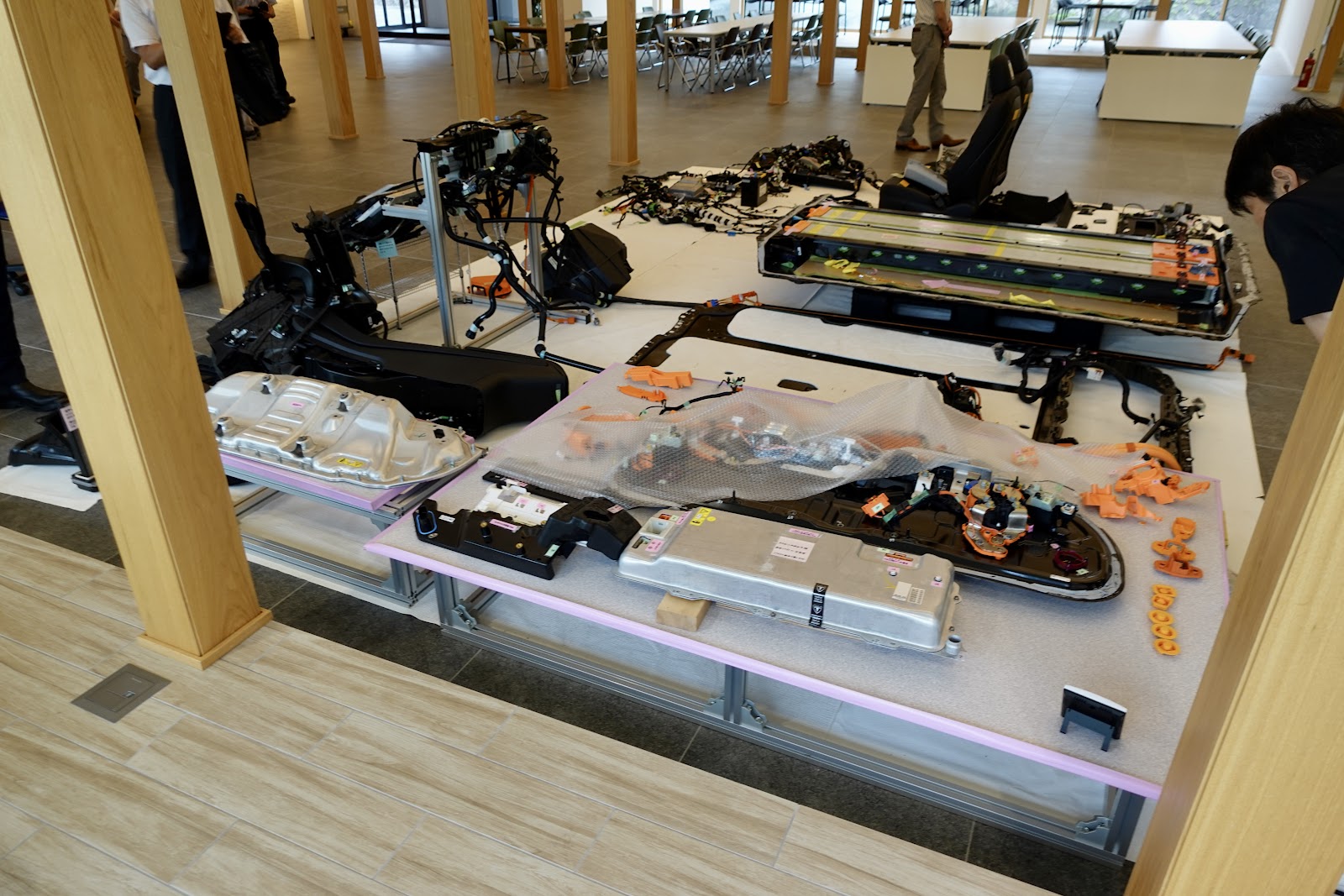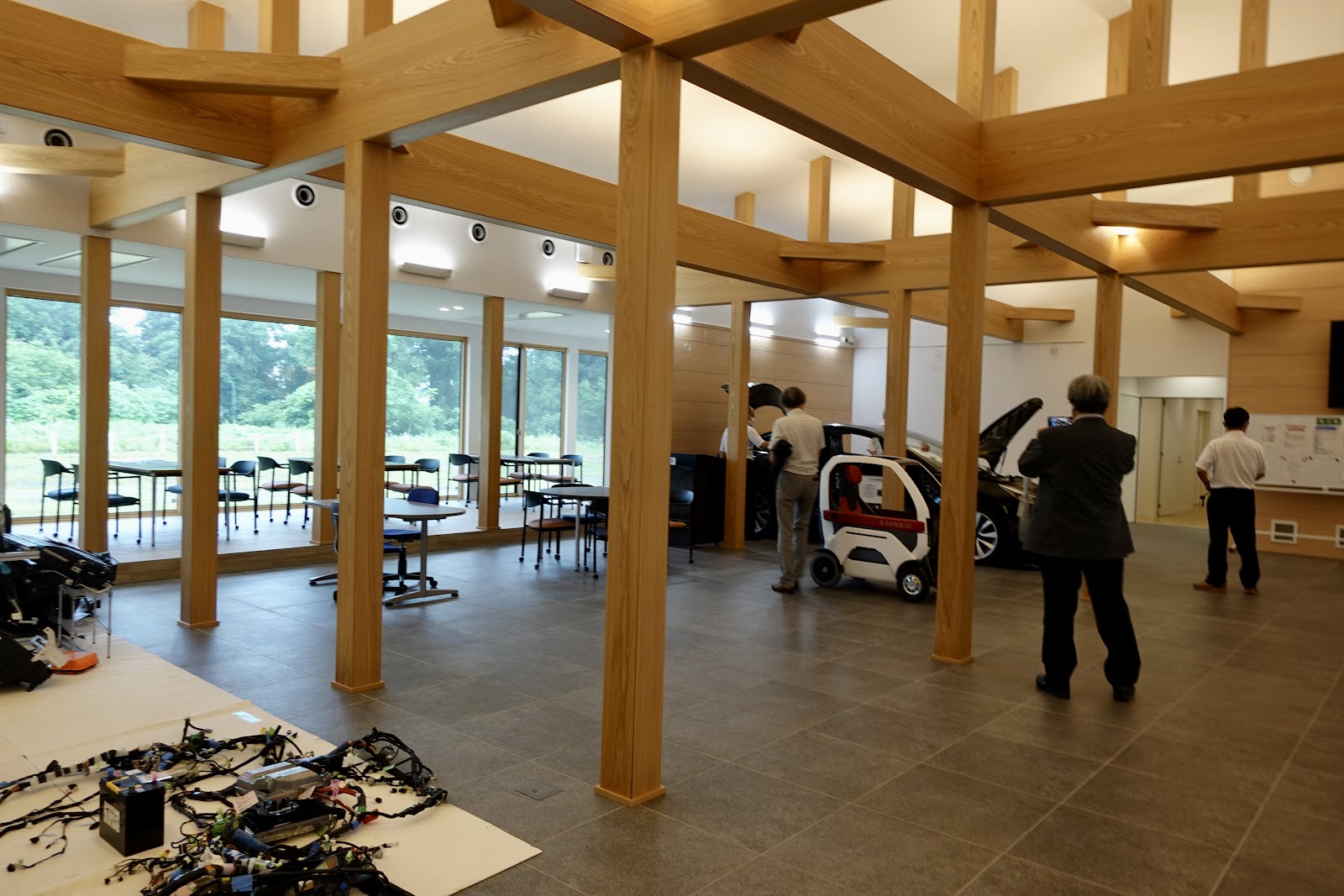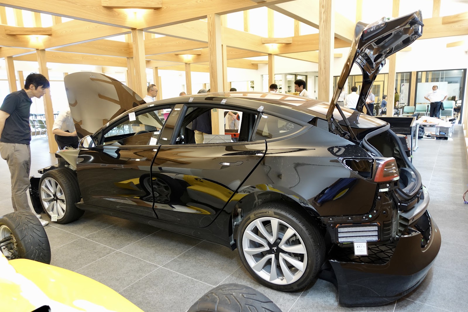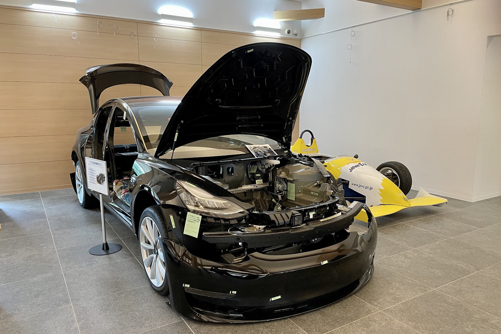 この中には、教室・学生ラウンジ・ものづくり室・図書館等が設けられている。さらに、日本EVクラブ製作のEVレーシングカー「電友一号」や、細かく分解された「テスラ・モデル3」、一人乗りのパーソナルコミューター「プラチナカー」などが展示されている。特に「テスラ・モデル3」の解体標本は、それだけでも見ごたえ十分だ。