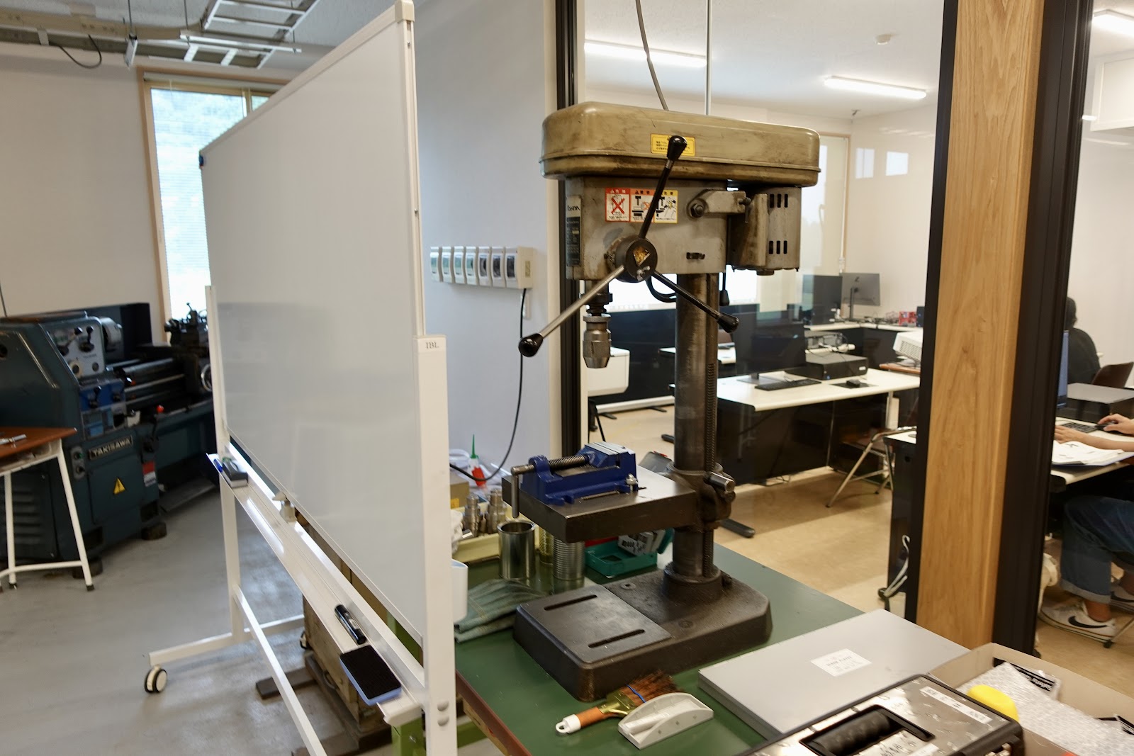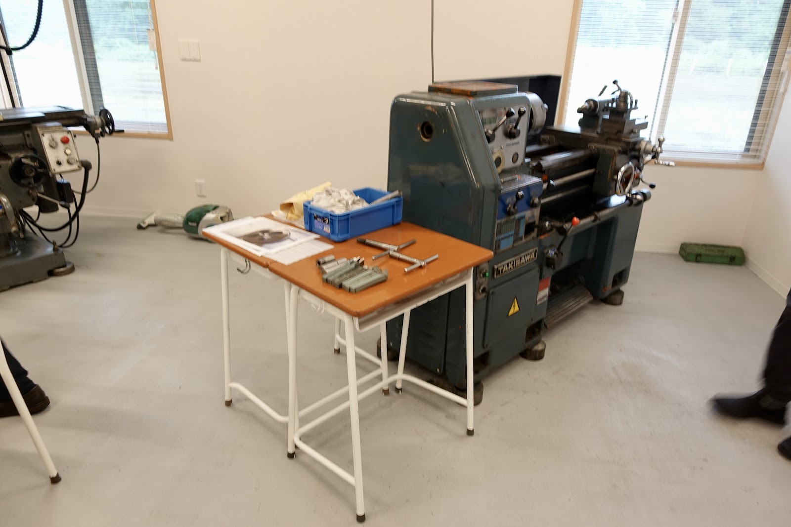 この教室の隣には「ものづくり室」がある。旋盤・ボール盤・フライス盤・溶接機の工作機械に加えて、それらに使用する工具一式が揃っている。この時代にアナログな機械のように思えるが、やはり自分の手で品物を考え・作り・仕上げるというのは、ものづくりの基本中の基本である。