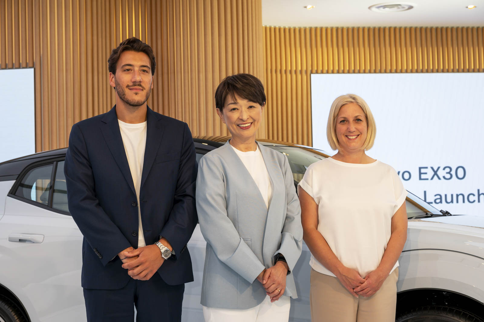 EX30発表を機に来日したコマ―ショル部門責任者フランチェスコ・スペチアーレ氏(左)とチーフインテリアデザイナー・リサ・リーブス氏(右)ともにEX30の前にて撮影に応じるボルボ・カー・ジャパン代表取締役社長不動奈緒美氏。