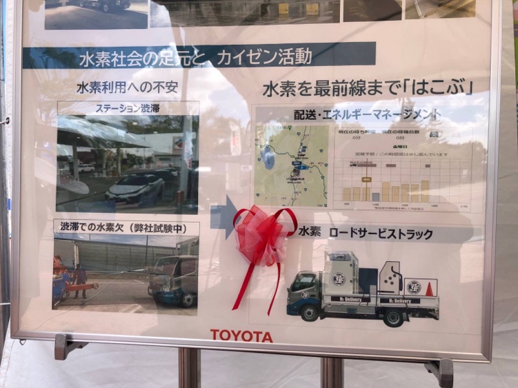 水素ロードサービストラックに関連して、展示ブースでは「水素社会の足元と、カイゼン活動」というパネルがあった。
