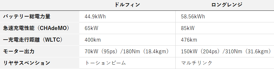 価格は航続距離(WLTC)400kmの「ドルフィン」が363万円、同476kmの「ドルフィン・ロングレンジ」(以下、ロングレンジ)が407万円だ。