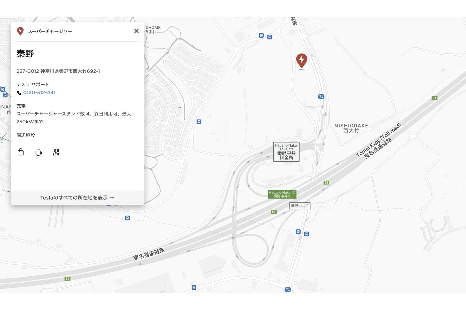 ファミリーマート秦野中井インター店(神奈川県秦野市)に最大250kWの充電能力があるテスラ車用充電器「スーパーチャージャー」が4基設置された。この店舗は、東名高速道路の秦野中井IC出口から、北にわずか300mほどに位置する。