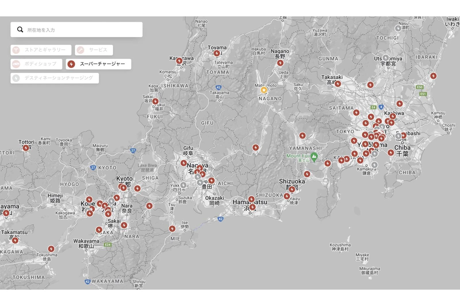 スーパーチャージャーの分布マップを見ると、東京と大阪を結ぶ東名高速道路(新東名も含む)と名神高速道路のIC近くにスーパーチャージャーが充実している。
