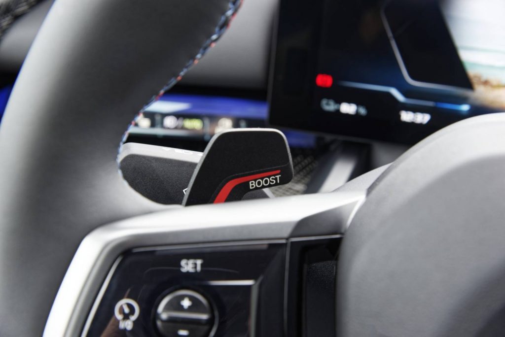 i5 M60 xDriveには、アダプティブサスペンションがおごられている。かつ、Mモデルなのでステアリングホイールコラムに「スポーツブースト」という瞬間的な加速をもたらすレバーまでついている。これは路上では使えません(笑)。