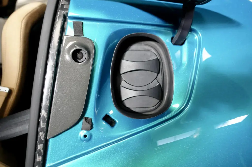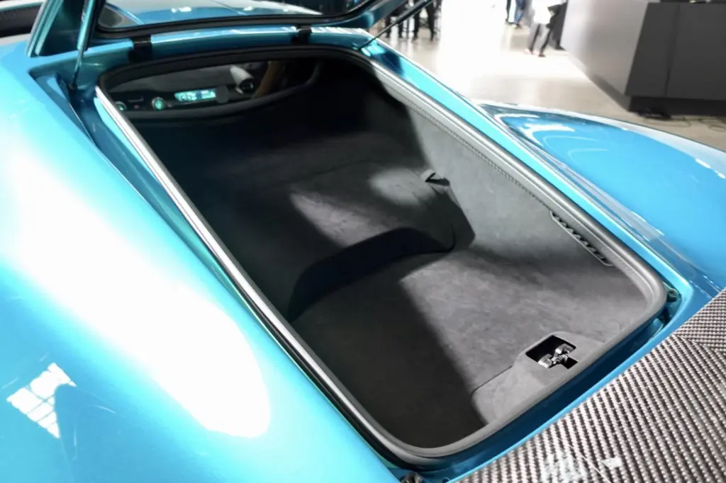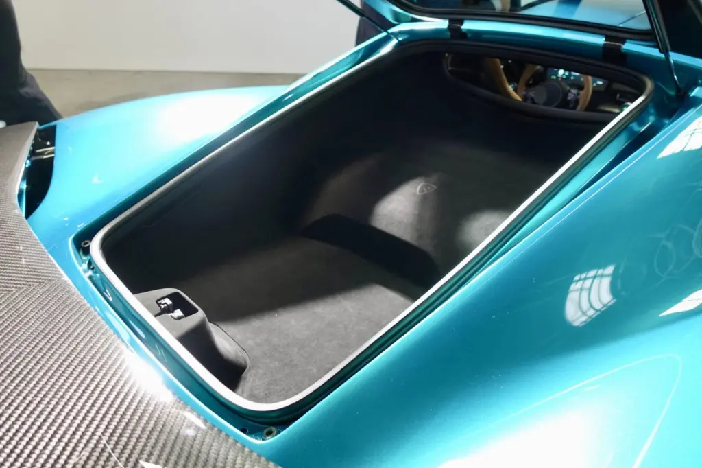 ネヴェーラは、直線だけの超性能にとどまらず公道を走るGTカーとしての性能も持ち合わせていると言う。そのためか、いたずらに大径ホイールにせず、20インチにとどめたのも納得できる。わずかではあるが、リアにはボストンバックが2つ程度入るトランクルームが設けられていた。エンジン車では恐らくこのようなスペースはないだろう。
