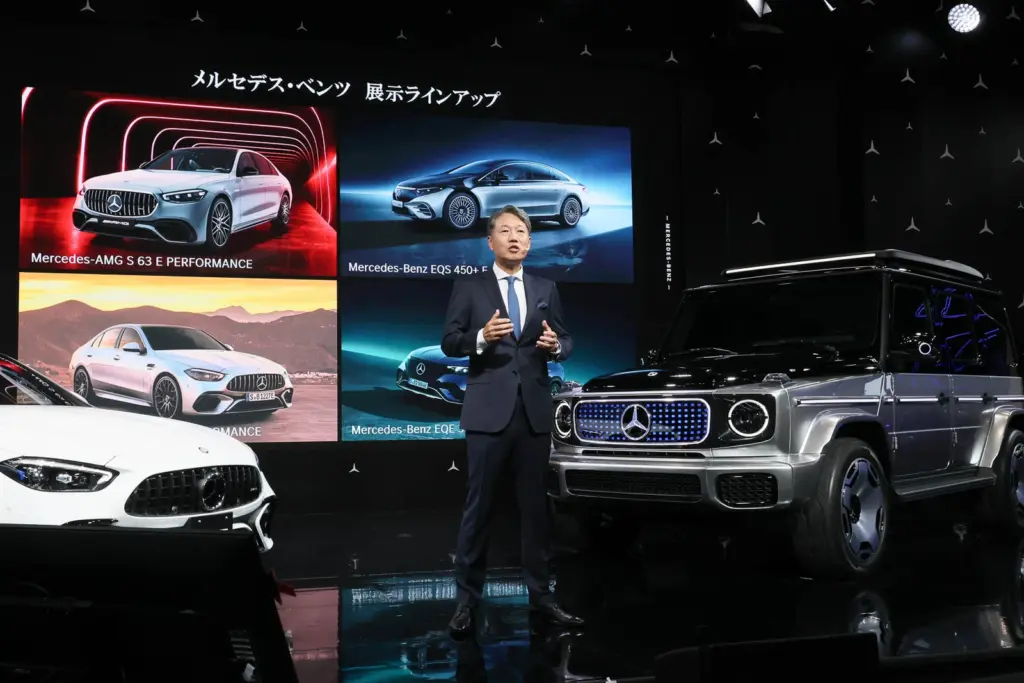 ジャパンモビリティショーに出展している輸入乗用車ブランドで、独自のブースを構えているのは「BMW」「BYD」、そして、「メルセデス・ベンツ」の3つだけ。「2019年の東京モーターショーから今日にいたるまで、世界中でさまざまな環境の変化がございました。自動車業界も大きな変革期のなかで困難がありましたが、こうしてジャパンモビリティショーが開催されることは大変喜ばしいことであり、弊社としては自動車はやはり実際に見ていただくことが大事であると考え、このジャパンモビリティショーでひとりでも多くの方にメルセデス・ベンツに触れてもらいたいという思いから、今回出展しました」と、社長の上野金太郎氏は語る。