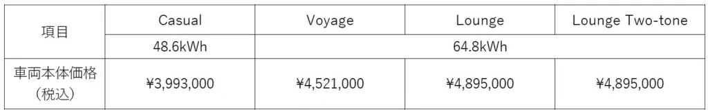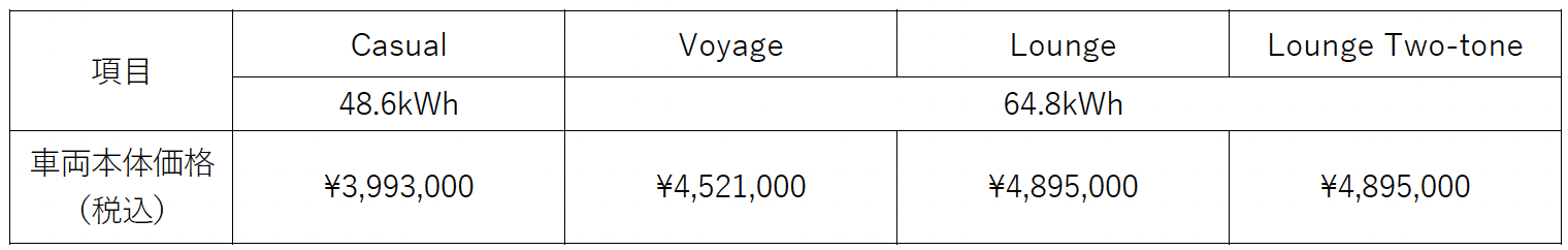 一充電走行距離は、48.6kWhバッテリーのCasualグレードが456km(WLTCモード、参考値)、64.8kWhバッテリーのLoungeグレードが541km、Voyageグレードが625kmと発表された。