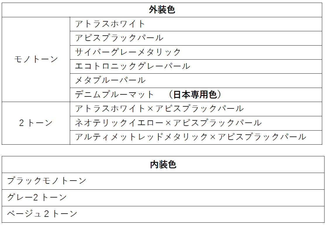 ボディカラーは、日本専用色の「デニムブルーマット」を含む8色があり、2トーンも3種類から選択できる。内装色も3色が用意された。