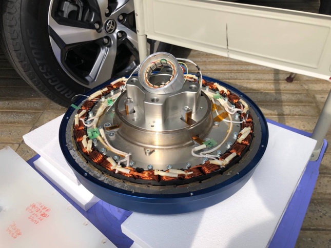 今回の展示では、ブリヂストン等と共同研究を進めている、タイヤ・ホイールの内側に受電コイルを設定するシステムの実機も公開された。