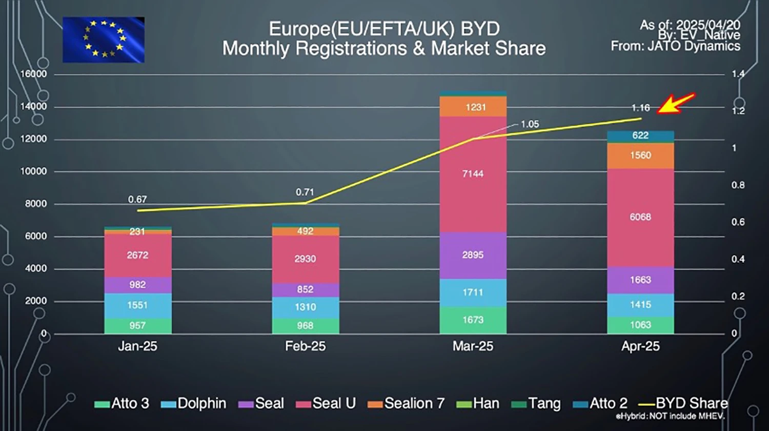 まず、BYDの欧州市場における最新動向について、このグラフはBYDの2025年シーズンにおける車種別の月間登録台数の変遷を示したものです。BYDは着々と販売台数を伸ばしており、直近の4月は欧州で1.2万台超を販売。欧州全体の登録台数に占めるBYDのマーケットシェア率は1.16%と史上最高を更新しており、欧州におけるBYDのプレゼンスが高まっている状況です。