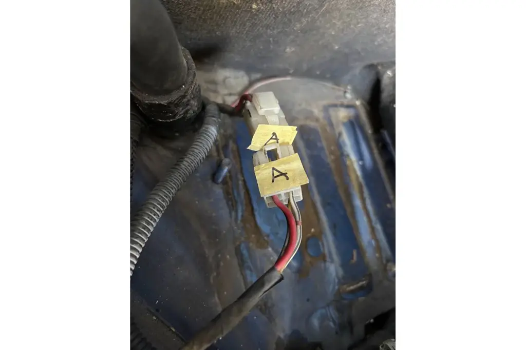 ということで、どんどんパーツを外していきますが、ヘッドライトやワイパーなど、一部の電装品は活かしていくので、ワイヤーハーネスは印をつけて選別して残していきます。