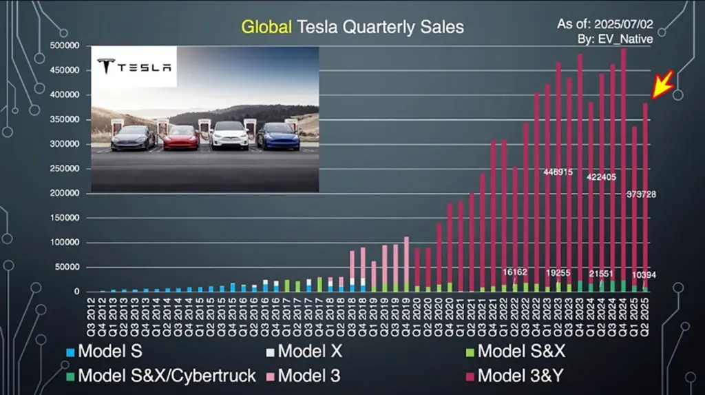 まず取り上げていきたいのがテスラの最新販売動向です。テスラは2024年シーズンに178.9万台と、2023年比でマイナス成長に留まってしまっていたという背景が存在します。その上で、2025年Q2におけるグローバル全体の納車台数は38万4122台と、2024年Q2と比較して-13.5%と販売減少を記録しました。車種別の販売台数について、モデル3とモデルYの販売台数の合計は37万3728台と、2年連続で販売台数が低下しています。とくにQ2は新型モデルYの販売のピークを迎えていたものの、それでも販売減少に歯止めがかからなかった格好です。