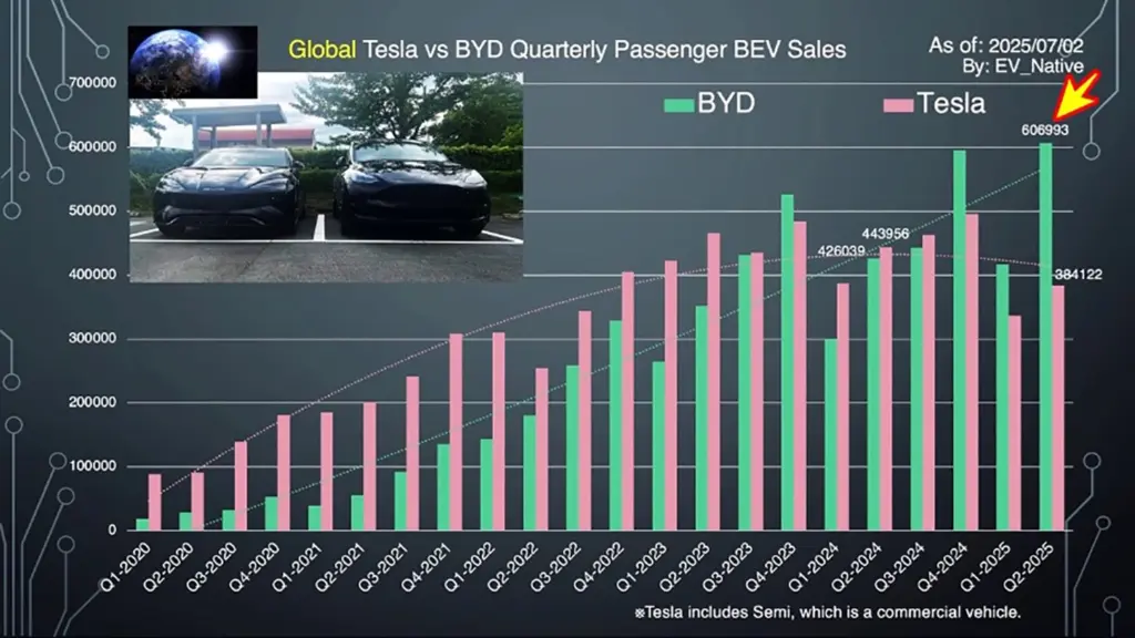 テスラとBYDの2025年第2四半期の販売台数が判明しました。テスラが大幅に販売台数を落としたことで、2025年の年間EV王者がBYDとなる可能性が確定的となりました。上半期における両社の現状と見通しを比較します。