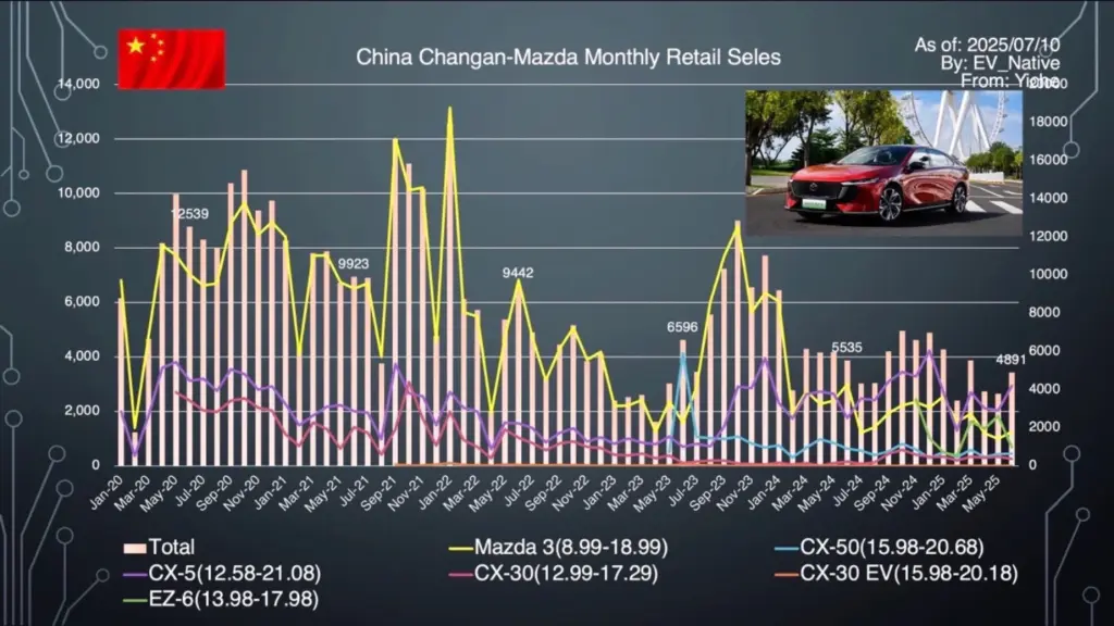車種別の内訳を見ると、とくに売れ筋モデルだったマツダ3の低迷が著しいです。これはコンパクトセグメントに、BYDドルフィンやシーガル、ジーリーXingyuanなどという超強力なEVが矢継ぎ早に投入されてしまったことが要因でしょう。その一方で、CX-5は月間2000〜3000台級ともち堪えているようにも見えます。
