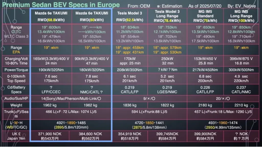 そして、このマツダに関する新たな動向として、EZ-6を欧州市場をはじめとする海外マーケットに輸出するという点が挙げられます。すでに6月から欧州の主要マーケットでは受注受付がスタートしています。欧州市場ではマツダ6eと名付けられ、全長4921mm、全幅1890mm、全高1485mm、ホイールベースが2895mmというミッドサイズセダンです。