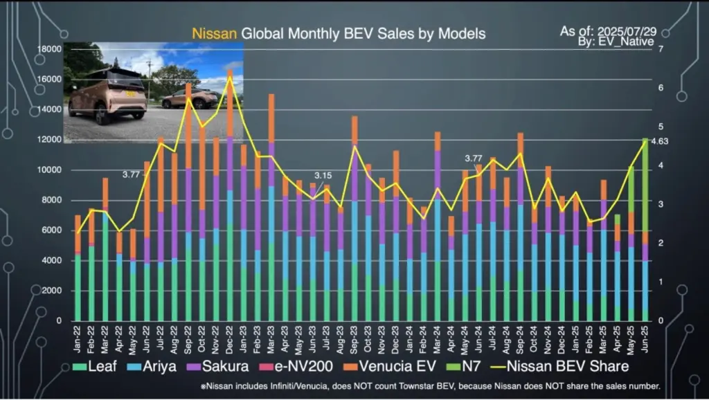 その一方で、現在日産でもっとも売れているEVがN7です。4月末にローンチしてから急速に販売台数を増加させ、最新データが判明している7月単体では6455台と絶好調です。8月は生産体制を増強して1万台の生産台数を計画するほどです。新車販売全体に占めるBEVシェア率も4.63%と、2023年1月以来となる高水準を記録しています。