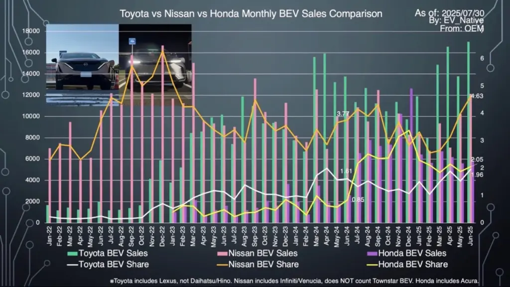 日本メーカーの2025年上半期の最新EV販売動向が判明しました。EVシフトで遅れているといわれている日本メーカーの立ち位置と下半期以降の注目EV動向を含めて解説します。