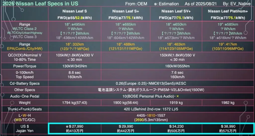 そして今回判明したのが、この秋に世界に先駆けて発売するアメリカ市場において、新型リーフの正式な値段設定が公開されたという動向です。まずアメリカ仕様の新型リーフのバッテリー容量は52.9kWhと75.1kWhの2種類を設定しながら、52.9kWhのSグレードのみ、2026年春以降に納車がスタート。今回値段が公開されたのは、S+、SV+、そしてPlatinum+の3グレードです。