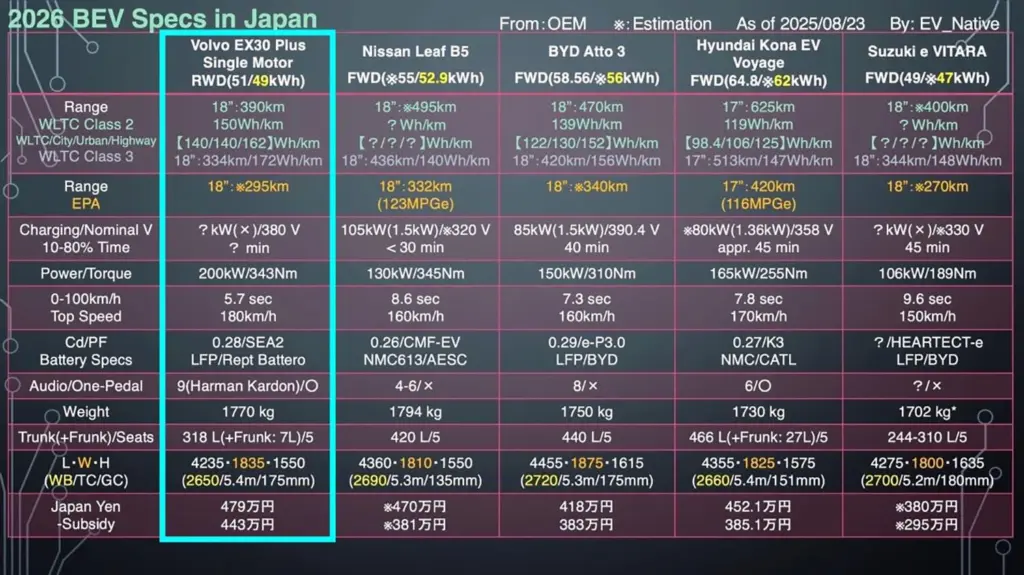 次に、EX30の競合となり得る新型日産リーフ、BYD Atto 3、ヒョンデ・コナなどのEV性能を比較してみましょう。もし仮に新型リーフが470万円程度からスタートした場合、EX30と同じような値段設定となるものの、補助金で差がつく見通しであることから、リーフのほうが割安になります。また、新型リーフは補助金の助けもあって、BYD Atto 3やヒョンデ・コナと同等の値段設定となりそうです。