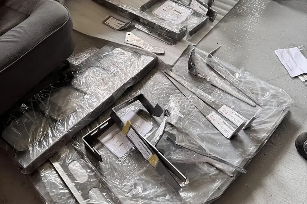 前回チラッと出てきましたが、第3弾でボディスキャンして設計した、パワーユニットのブラケットやバッテリーを収める各パーツたちが、精密板金屋さんから大量に到着。
