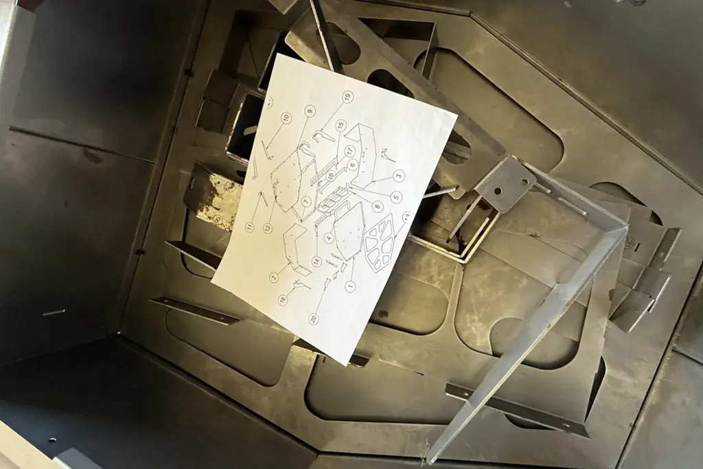 設計図を見ながらが、各パーツを仮組みしてみます。これが、ジグソーパズル的に難解。設計図面とにらめっこしながら、パーツを探しては仮組みするのですが、厚さ2mmと5mmの鉄板を加工したもので重いし、鋭利な角もあって危ないし、しかも、猛暑の工場での作業はツラい……。