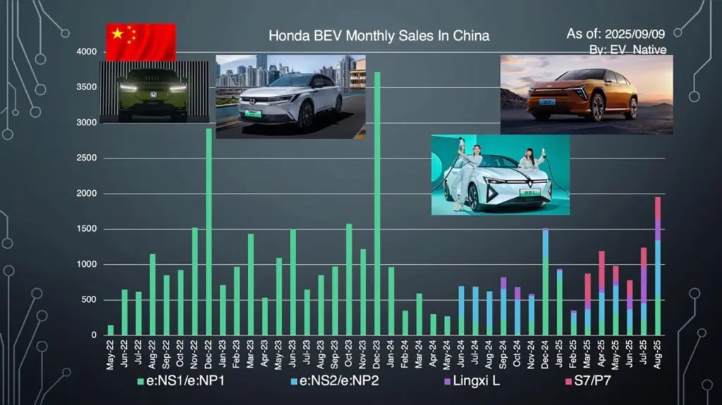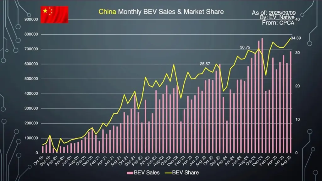 次に、その新エネルギー車のなかでもBEVとPHEV、EREVそれぞれの販売割合を確認しましょう。2022年8月時点での新エネルギー車全体に占めるBEVのシェア率は75%と、BEVが圧倒的なシェア率を示していたものの、直近の2025年8月単体では62.36%とBEVシェア率が減少している状況です。とはいえ、2024年8月の57.23%と比較すると、むしろNEV全体に占めるBEVの割合は増加傾向にあります。