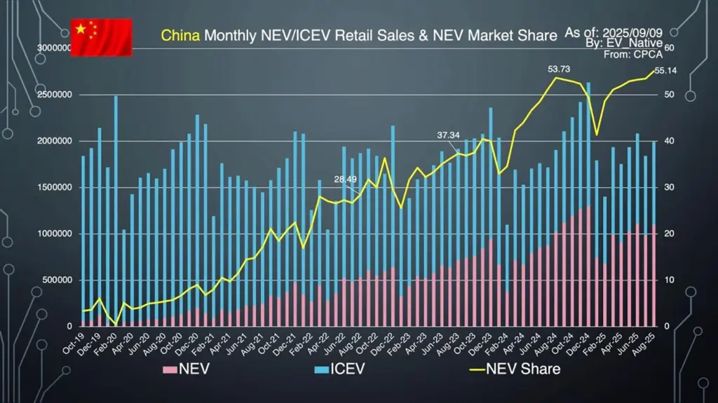まず、中国市場における8月のBEVとPHEVの合計を示した新エネルギー車の販売台数は110.1万台と、前年同月比+7.5%の販売増加を記録しました。また、新車販売全体に占める新エネルギー車の販売比率は55.14%と史上最高のシェア率を更新しました。すでに過半数が新エネルギー車に置きかわっている状況です。