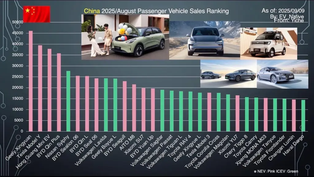 はじめに、8月単体の内燃機関車も含めたすべての販売ランキングトップ30では、新エネルギー車が15車種ランクイン。トップ10に絞ると7車種が新エネルギー車です。