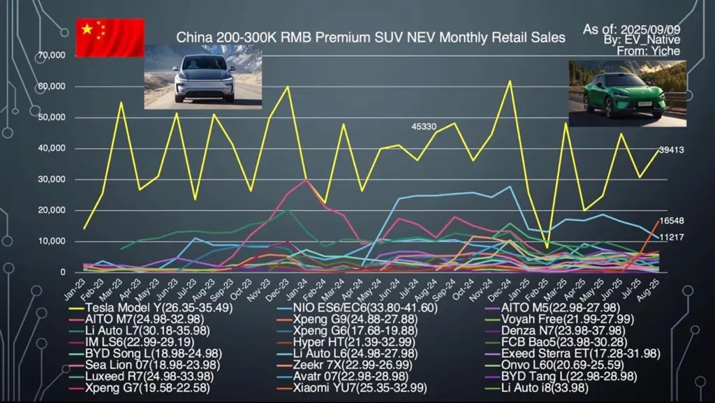 また、BYDが13車種を席巻しており、圧倒的な存在感を感じさせます。さらに、ファーウェイのAITO M8が9位にランクインしており、日本円で800万円級にも及ぶファーウェイの高級EVが非常に人気となっている様子も見てとれます。