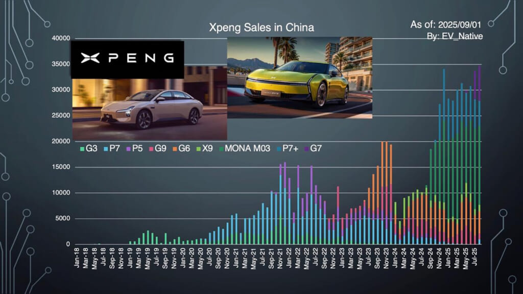 Xpengは、最新の8月では中国国内で3.5万台弱と、史上最高の販売台数を更新しました。最新のミッドサイズSUVであるG7には、「Turing 」というXpeng独自内製のAIチップを搭載することで、車両全体におけるAI演算能力が最大で2250TOPSを実現。これは、テスラAI.4、Nvidia Drive Thor-Uと比較しても3倍という桁違いの能力です。