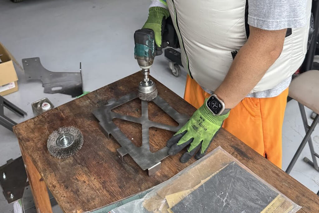 まずはカップブラシとサンドペーパーでサビ落とし&塗装下地を作ります。カップブラシの研磨跡が、なんかカッコよいので、クリアで塗装してあえて金属感を残してみます。