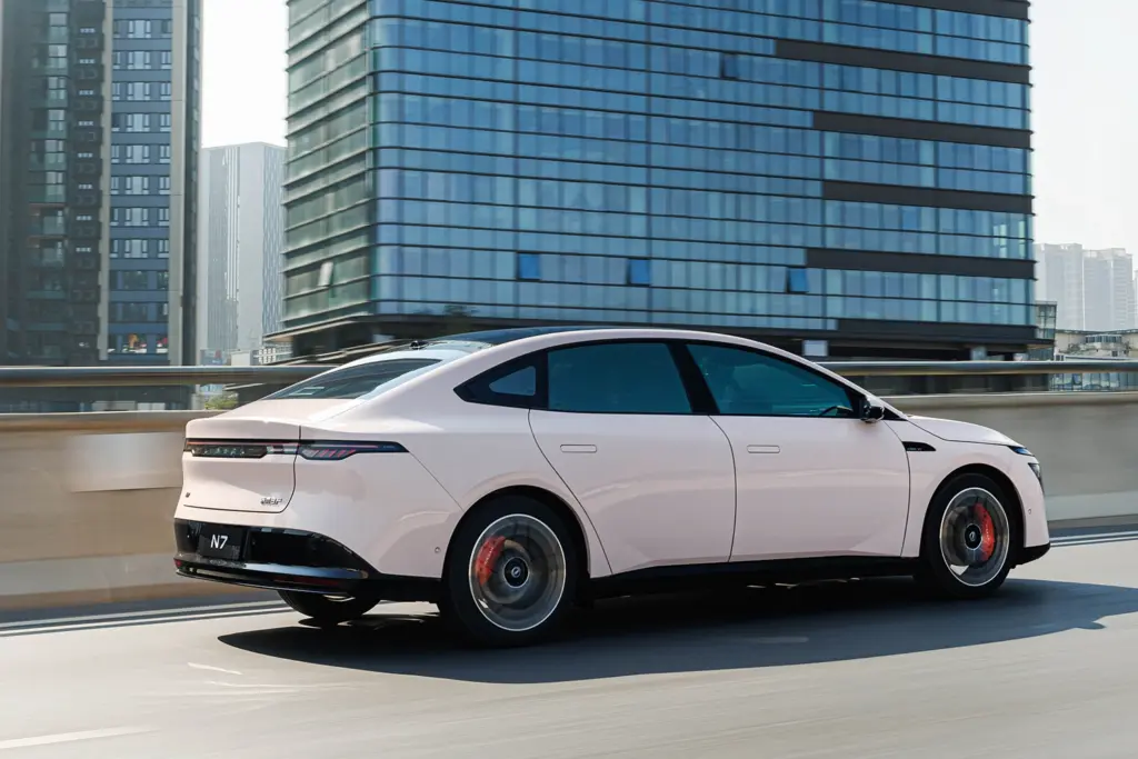 ふたつ目は、いかにもEV(N7にはPHEVもあり)というシンプルなデザインです。まるでテスラのようなグリルレスのフロントフェイスをはじめ、横一文字の前後ランプ類、強いキャラクターラインをもたないサイド面など、もはや記号的といえるほどの徹底ぶり。さらに、サッシュレスドアの面一感がこれをあと押ししています。
