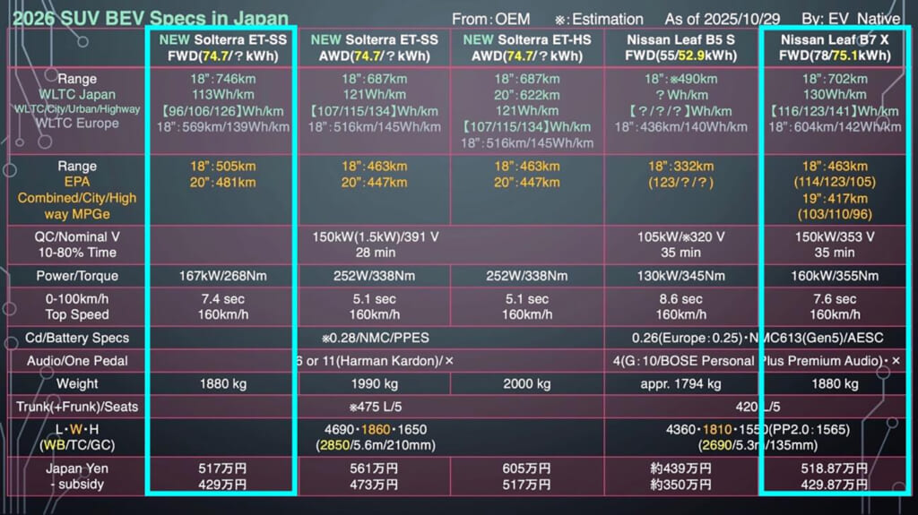 スバルが日本国内でソルテラのモデルチェンジを実施し、EV性能を飛躍的に高めながら大幅値下げを実施することで、兄弟車であるトヨタbZ4Xを凌ぐコスト競争力を実現してきました。気になる新型リーフなどの競合とのコスト競争力を含めて分析します。