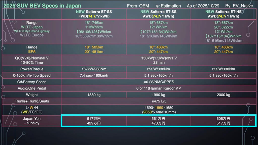 その上で、今回の新型ソルテラに対して注目するべき点が値段設定です。エントリーグレードとなるFWDの ET-SSグレードは517万円の設定。中間グレードであるAWD ET-SSグレードが561万円、装備内容を充実させたET-HSグレードが605万円の設定となっています。