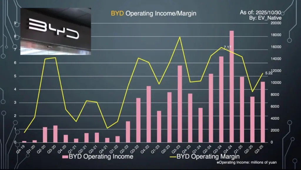 中国BYDの2025年第3四半期の決算が発表され、収益性がついに悪化し始めたという驚きの決算内容であることが判明しました。
