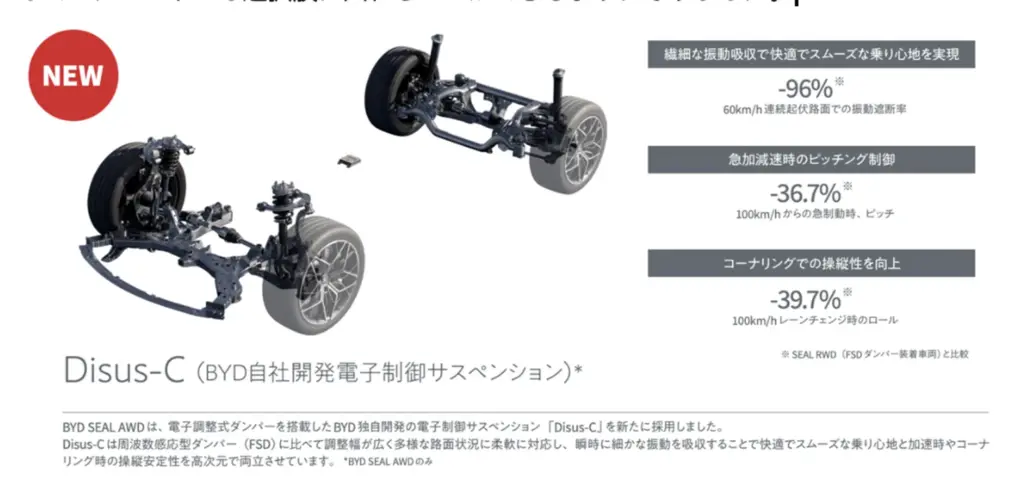 Disus-CはBYD独自内製サスペンションです。これまでのFSDと比較しても調整幅が広く、さらに振動吸収速度も向上しており、乗り心地とコーナリング時の操縦安定性を高い次元で両立することができます。