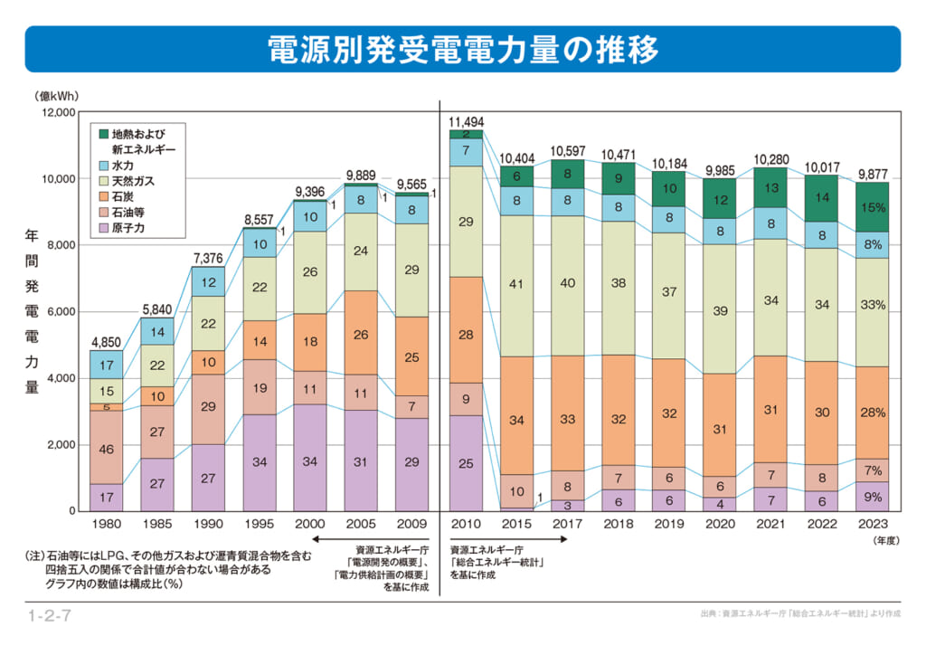 資源エネルギー庁が2025年4月に公表した『2023年度エネルギー需給実績(確報)』によると、日本では2023年時点で火力発電が約69%(石炭:約28%、天然ガス:約33%、石油など:約7%)、原子力が約8.5%、再生可能エネルギーが約23%程度となっている。一方、ノルウェーでは水力発電が90%以上を占め、フランスでは原子力が約70%を占めるなど、国によってその構成は大きく異なる。