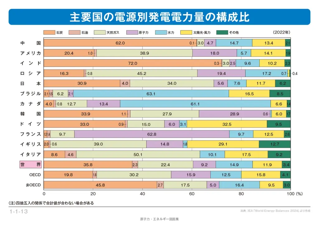 資源エネルギー庁が2025年4月に公表した『2023年度エネルギー需給実績(確報)』によると、日本では2023年時点で火力発電が約69%(石炭:約28%、天然ガス:約33%、石油など:約7%)、原子力が約8.5%、再生可能エネルギーが約23%程度となっている。一方、ノルウェーでは水力発電が90%以上を占め、フランスでは原子力が約70%を占めるなど、国によってその構成は大きく異なる。