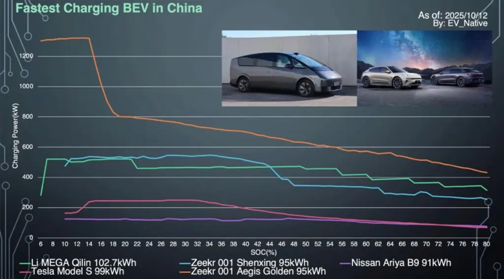 ちなみにこのグラフは、95kWh搭載グレードのZeekr 001をはじめとして、充電出力と充電残量との相関関係を示したものです。充電スピードに定評のある競合と比較しても明らかに優れている様子が見て取れます。ちなみにピンクで示されているのがテスラ・モデルS、紫で示されているのが日産アリアB9の充電カーブです。こう見ると、日産アリアはZeekr 001のピーク出力の10分の1以下であり、中国市場における急速充電体験が別次元にある様子を容易にイメージできるはずです。