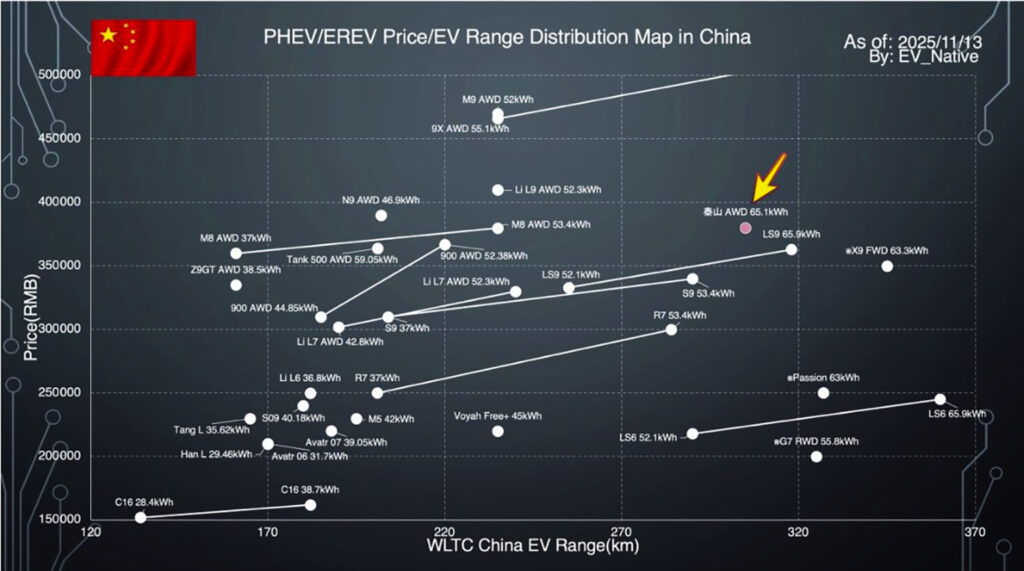 とくにTaishanは、熱効率45.18%を実現する1.5リッターエンジンとデュアルモーターを組み合わせたPHEVです。65kWhという超大容量バッテリーを搭載することで、EV航続距離はCLTC基準で350kmを実現。65リットルの燃料タンクを組み合わせると、最長航続距離は1430kmに達します。動力性能も最高出力380kW、最大トルク705Nmを発揮することで、0-100km/h加速も5.2秒と俊敏です。