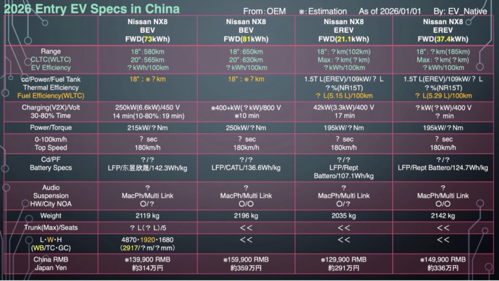 ちなみにSunwoda製の73kWhバッテリーは、N7と同様のバッテリーを共有している可能性が高く、その場合は400Vシステムとなります。日産としては、エントリーグレードはN7と共有する400Vシステムを採用してコストダウンを図りながら、上級グレードの81kWhには5C超急速充電に対応する800Vシステムを採用することで先進性をアピールしてくるのではないかと推測できそうです。とはいえ、N7は最大250kWの急速充電に対応し、SOC10%から80%まで19分で充電可能であり、エントリーグレードでも実用的な充電性能であることも間違いないでしょう。