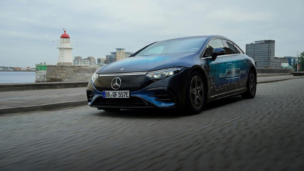 全固体電池を搭載したのは、すでに市販されているEQSで、これはメルセデス・ベンツのEVのフラッグシップであり、4ドアセダンである。